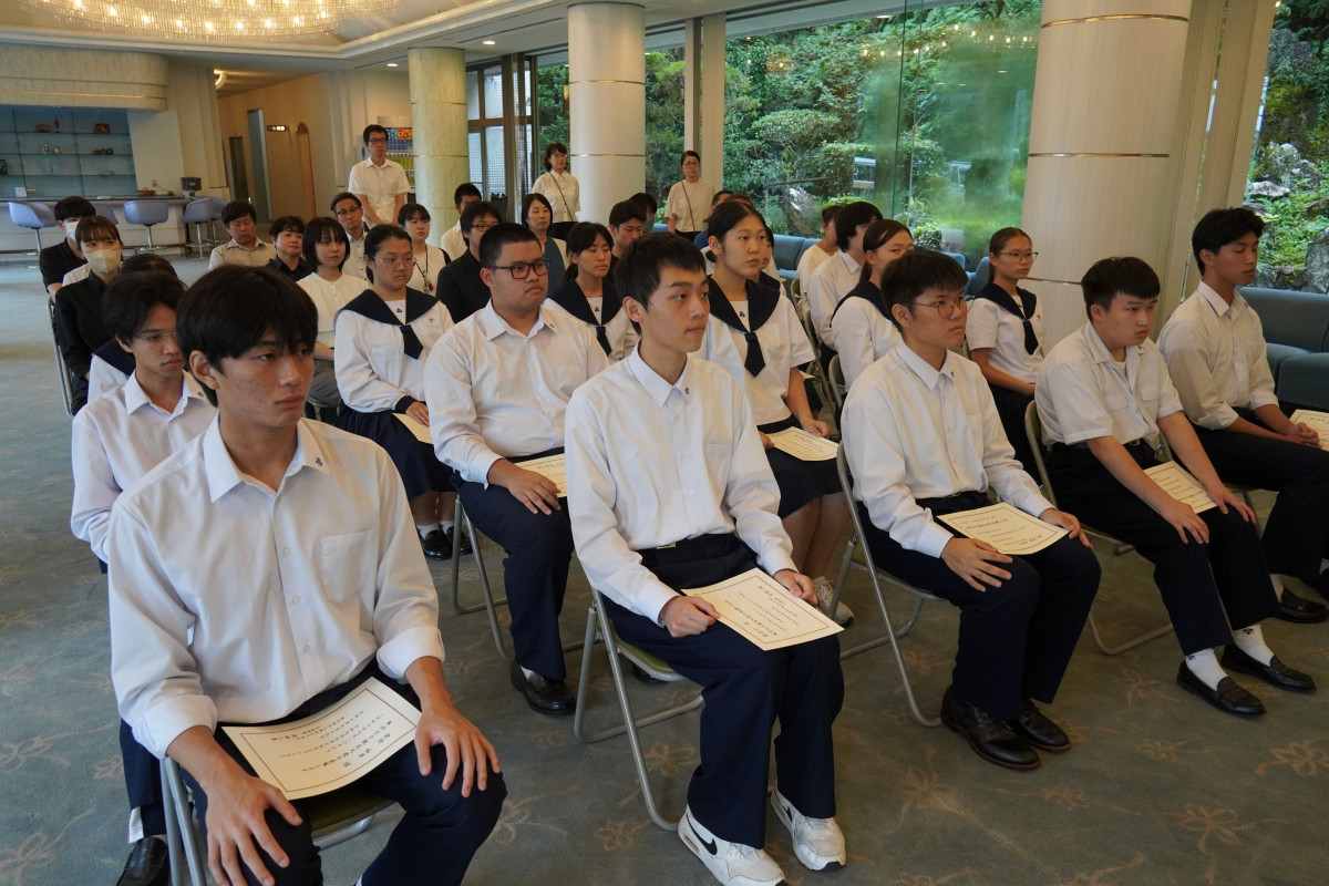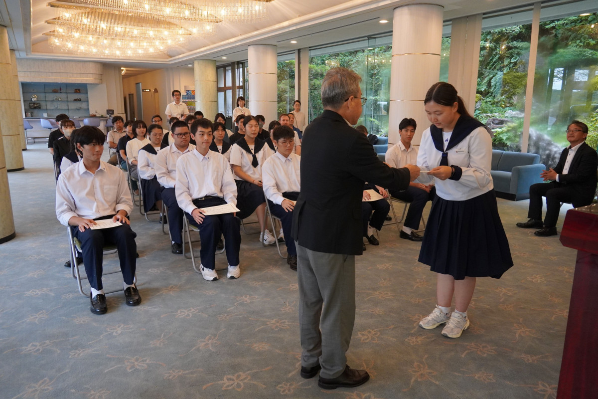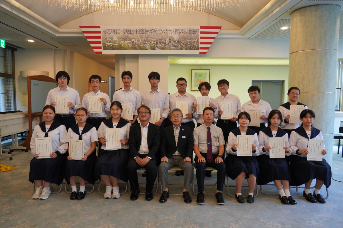 明徳の留学生たちが観光大使を務めるのは今年で4代目になります。委嘱された生徒たちにはそれぞれ観光大使の名刺200枚と外国語版の奥四万十観光ガイドブックが渡されました。
