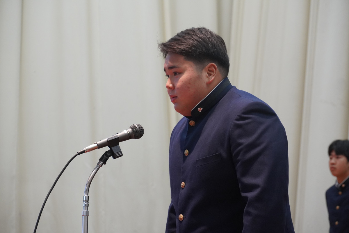 式の冒頭では、冬休み期間中に行われた大会について、男女バスケットボール部のキャプテンより報告がありました。続いて、3学期に全国大会への出場を控えているクラブのキャプテン(高校ゴルフ部男女、相撲部、ソフトボール部、和太鼓部、高校卓球部男女、中学男子卓球部、空手部)が登壇し、大会への意気込みや目標を力強く語りました。