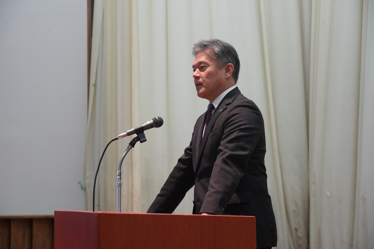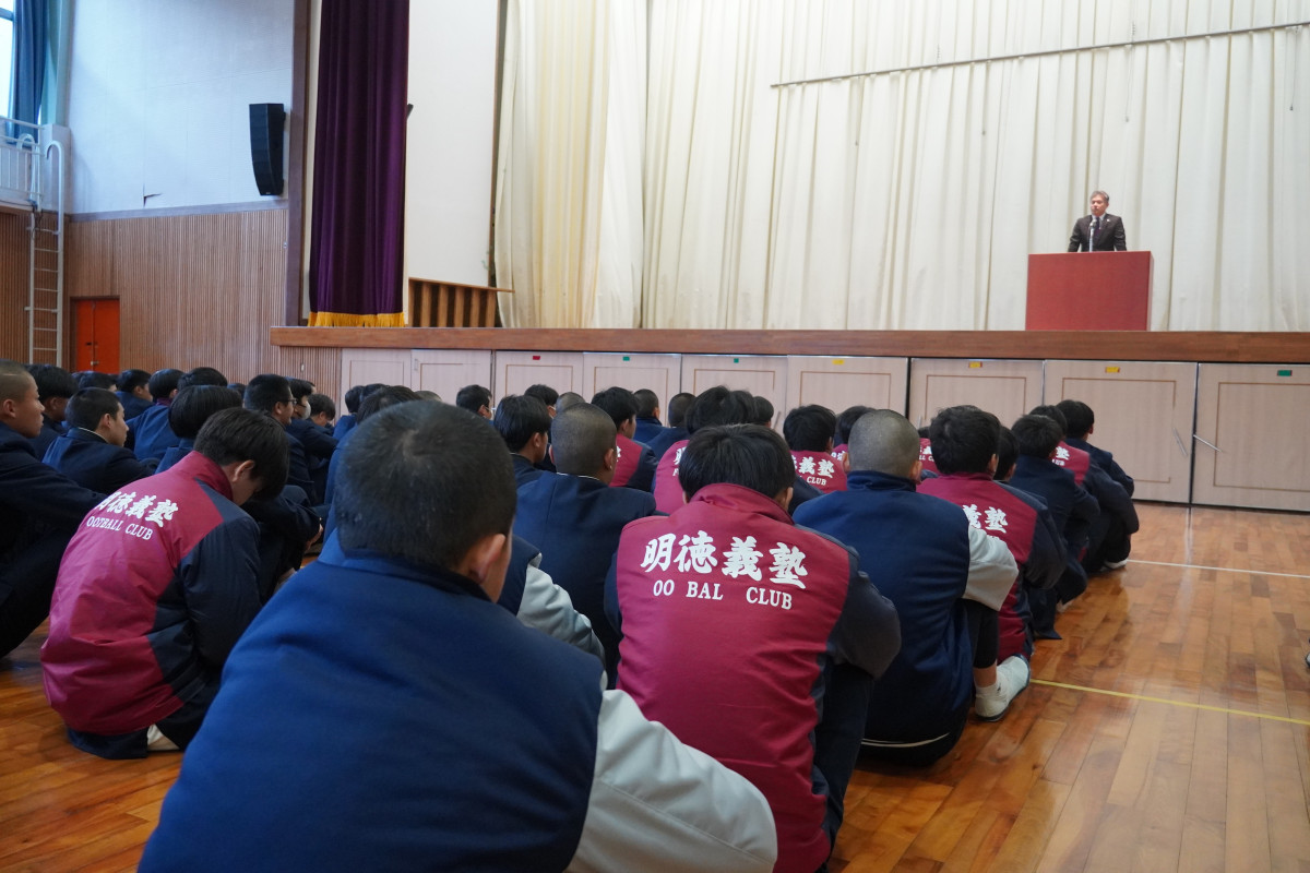 さらに、世界情勢が大きく変化する中で、明徳の生徒一人ひとりは「地球村の明徳人」であるというお話がありました。国籍に関係なく互いを仲間として認め合い、心のつながりを大切にしてほしいこと、そして毎朝の朝礼で行っている世界平和への祈りには、そのような思いが込められていることを改めて伝えられました。