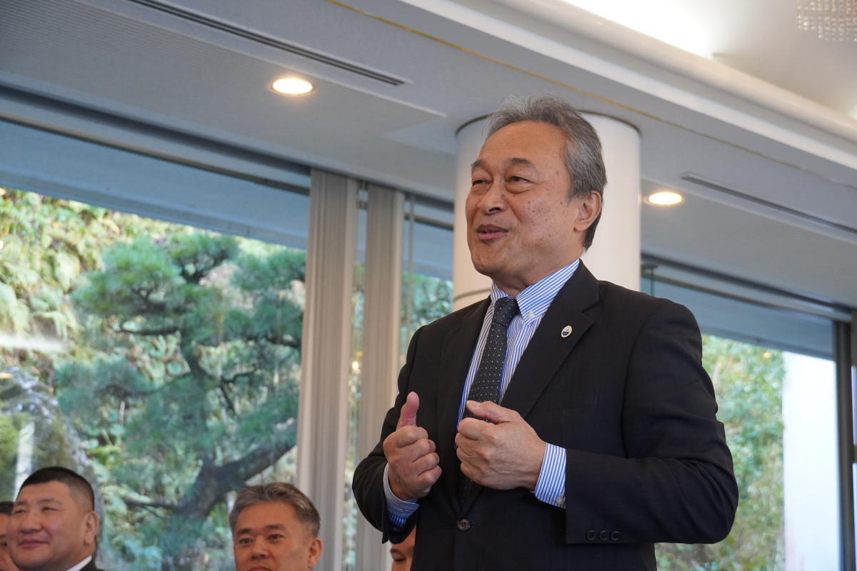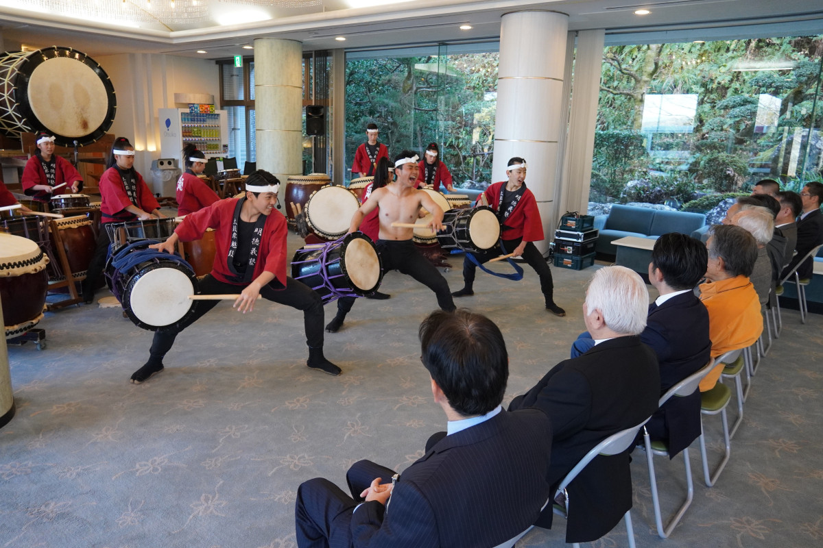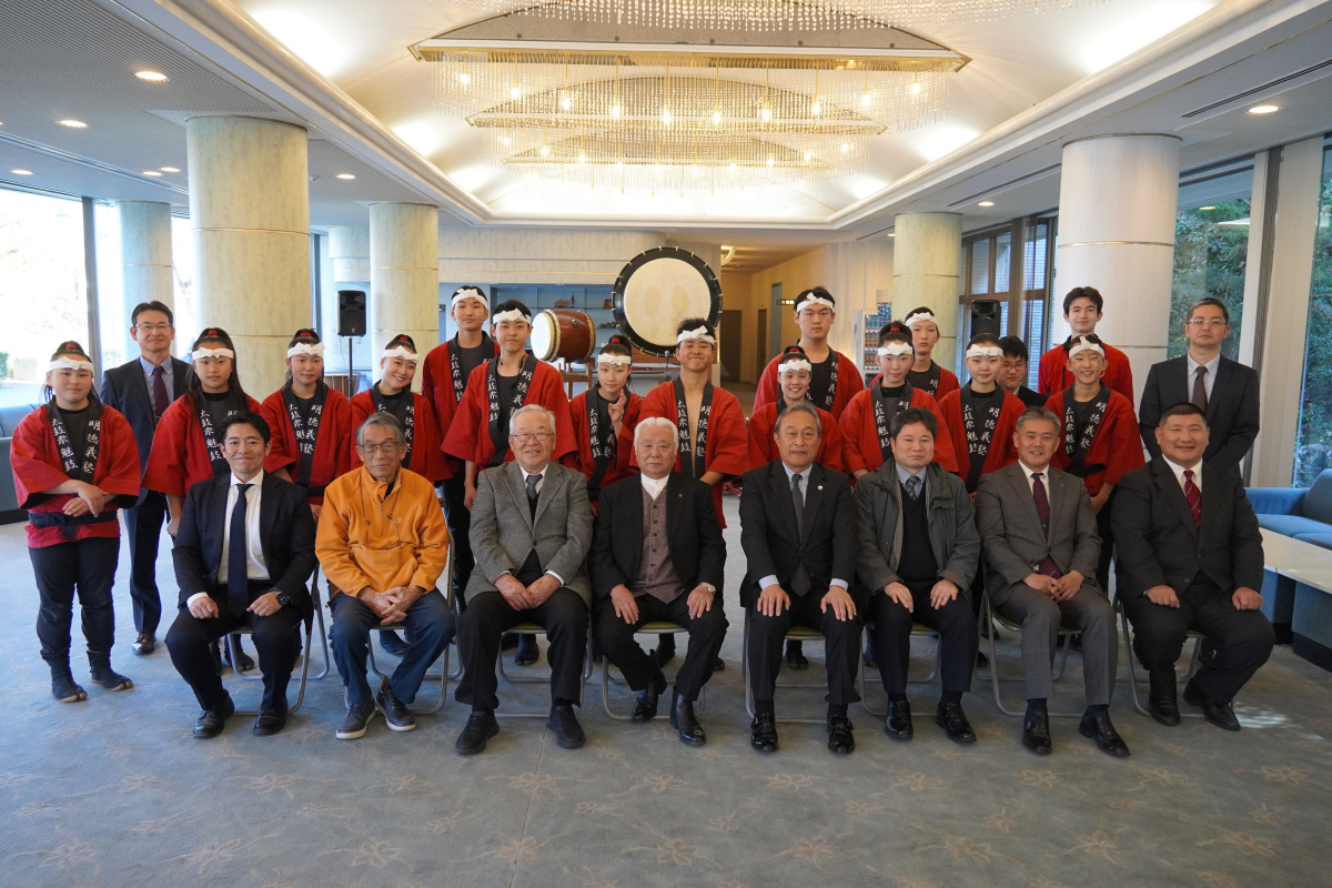 大使ご一行は、本校到着後、和太鼓部による迫力ある歓迎演奏で温かく迎え、校内見学や授業参観を行いました。留学生が多く在籍する本校ならではの国際色豊かな学習環境にも強い関心を寄せられ、熱心に寮や教室内をご覧になっていました。