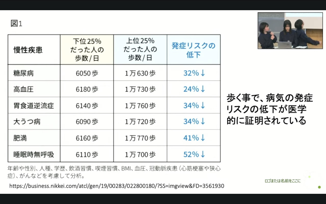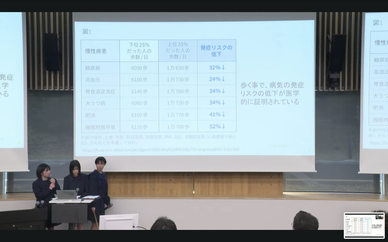 発表では、日常の健康づくりをテーマに、歩行データと食習慣を組み合わせて健康行動を促すアプリのアイデアについて紹介し、多くの大学関係者や高校生の前で堂々とプレゼンテーションを行いました。