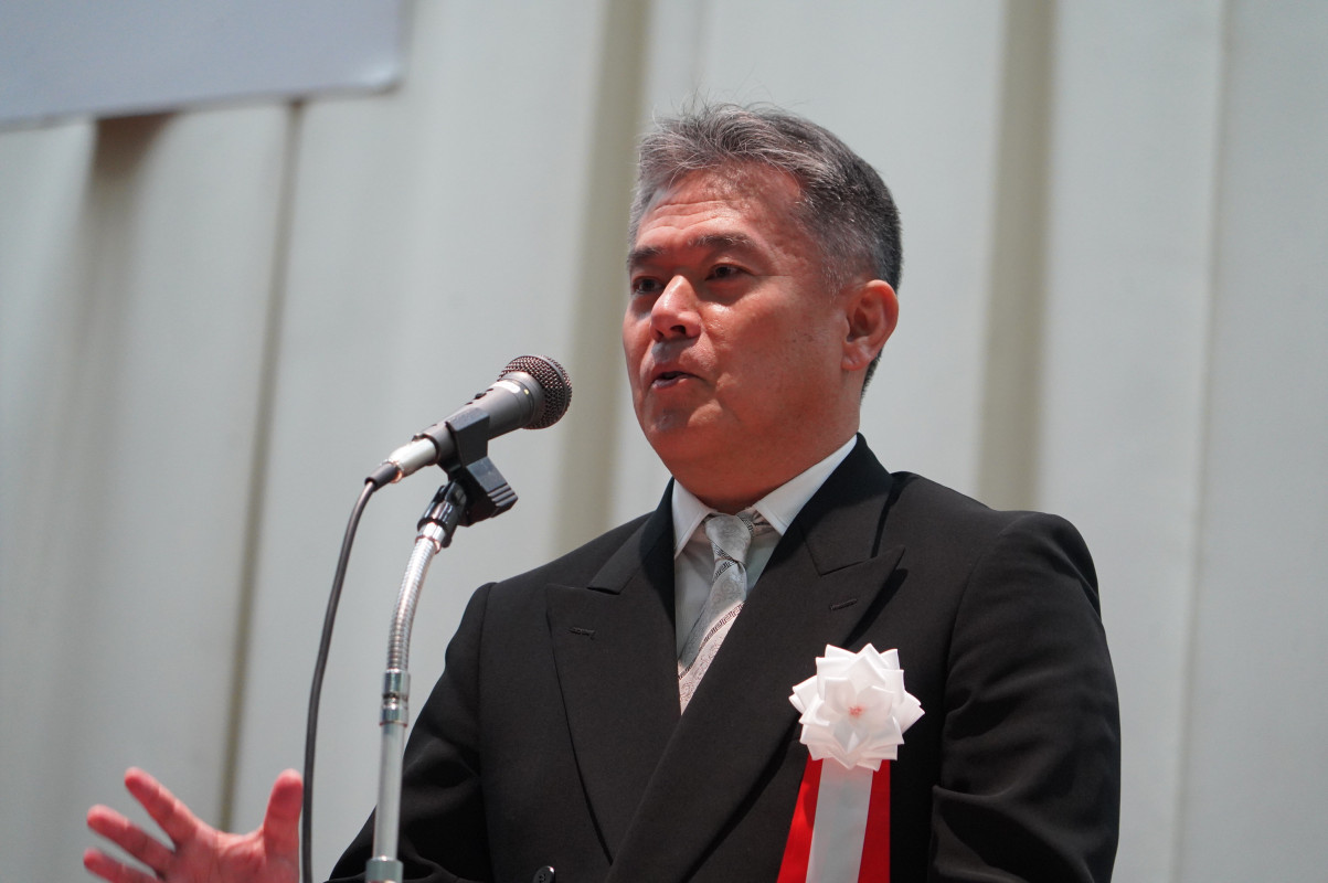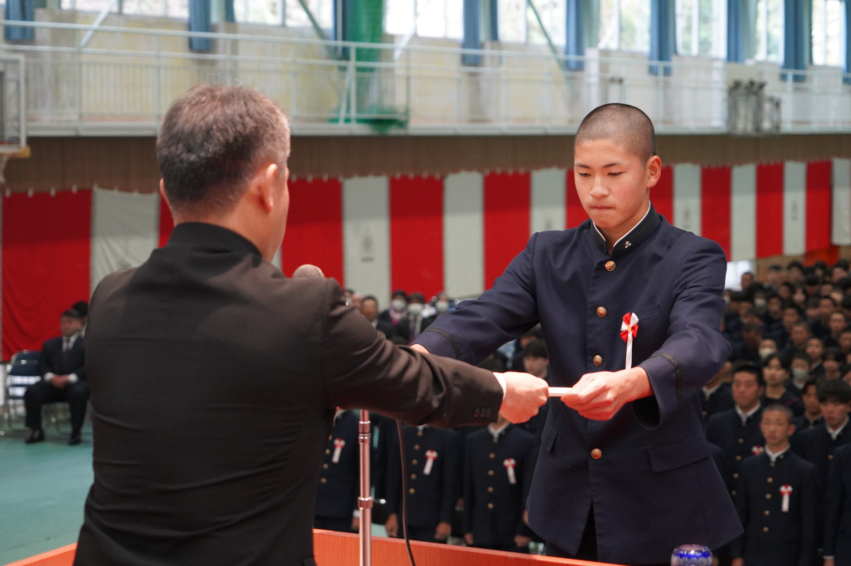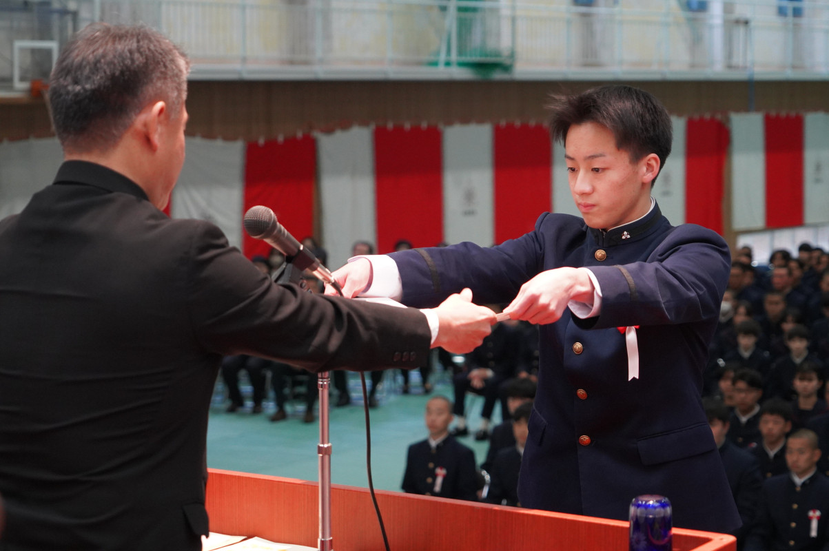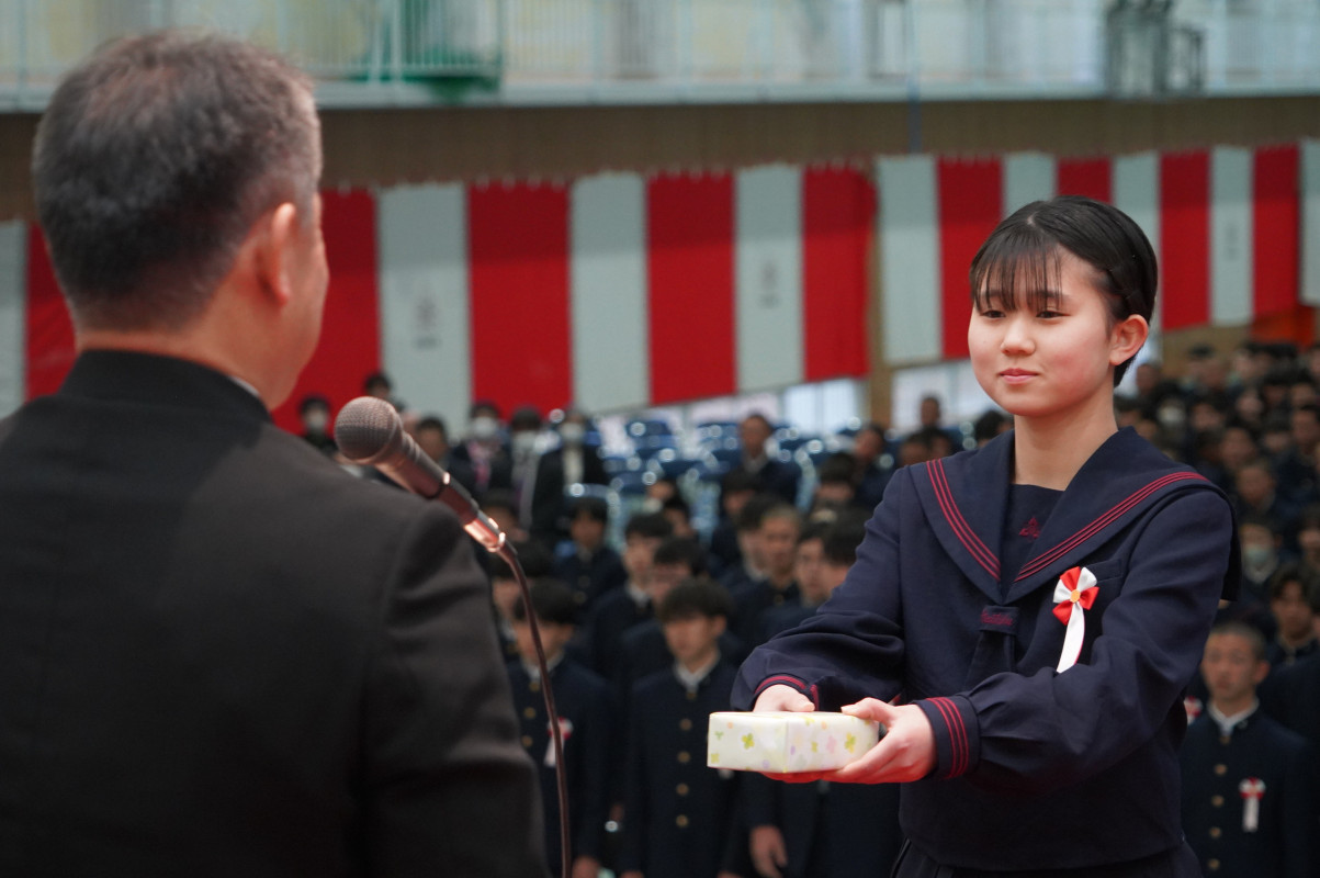 嵜本校長からは「58名の卒業生の皆さん、ご卒業おめでとうございます。震災やコロナ禍という困難な時代を乗り越え、仲間と支え合いながら大きく成長しました。日々の努力や小さな行いを大切にする姿勢、感謝と思いやりの心は、皆さんの確かな力です。「一刻生涯」の精神を胸に、限りある時間を大切にし、次のステージでも力強く歩んでいくことを願っています」との言葉をいただきました。