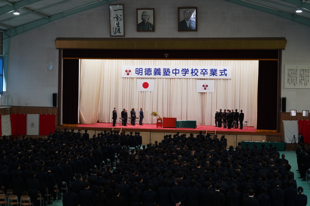 3月13日、本校体育館において、第52回明徳義塾中学校卒業式を挙行いたしました。晴れやかな春の日差しのもと、54名の卒業生が新たな一歩を踏み出しました。式典は厳粛かつ温かな雰囲気の中で行われ、卒業生一人ひとりの成長を感じる、心に残る一日となりました。