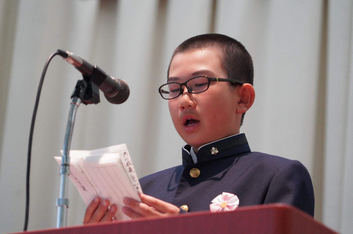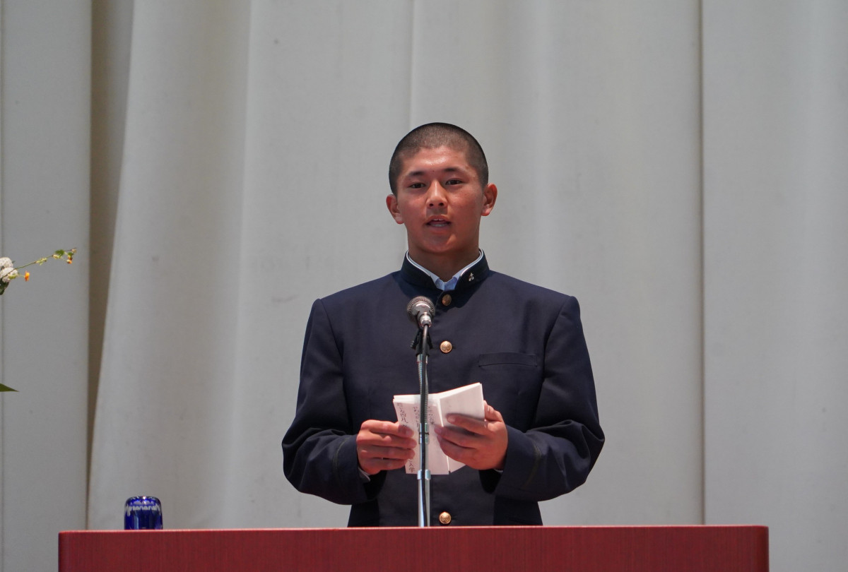 春のあたたかな風に包まれ、新たな季節の訪れを感じるこの良き日、これまで大切に育ててくださった両親をはじめ、多くの方々に支えられながら、入学式の日を迎えることができました。期待と少しの不安を胸に、私たち新入生一同は明徳義塾中学・高等学校に踏み出します。父がかつて立ったこのグラウンドに私も立てることの喜びと誇りで今、胸がいっぱいです。今日という日を新たな出発点として、仲間と共に学び、感謝の気持ちを忘れず、夢や目標に向かって一歩一歩努力を重ねてまいります。(一部抜粋)