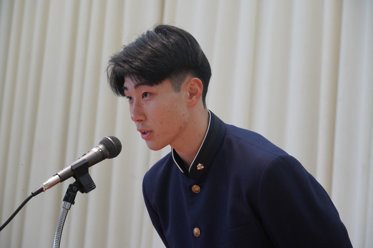 12月19日、本校体育館にて2学期の終業式が行われました。はじめに、12月に開催される「ウィンターカップ」に出場する男女バスケットボール部の名本惺飛キャプテンと森山優花キャプテンが、全校生徒の前で力強く決意表明を行いました。続いて、「家族のきずな作文コンクール」の表彰式が行われ、村田絆太さん(1年1組)、景山 成さん(1年2組)、佐藤亜子さん(1年2組)、岡村袈由さん(1年1組)、下川拓海さん(1年2組)の5名が表彰されました。また、11月6日から短期留学に来ていたオーストラリアの姉妹校PLCシドニーの生徒たちにも修了証書が授与されました。次に、ゴルフ部の佐藤小洛さん(6年・英語)が、12月に行われた「ユニクロ日本ジュニアカップ」での優勝報告を行い、あわせて2月にオーストラリアで開催される「オーストラリア女子アマチュア選手権」への出場に向けた意気込みを語りました。その後、令和8年度生徒代表への任命書授与が行われ、代表として続木虎太朗さん(5年B組)が、「生徒全員が仲良く、困った時には助け合える学校にしていきたいです。1年間よろしくお願いします」と抱負を述べました。最後に、嵜本宏明校長より、数多くの表彰に対する称賛とともに、インフルエンザへの注意喚起、「明徳人」として学校全体が一つの家族であること、そして来年再び元気に登校する際には、それぞれが目標を持って帰ってきてほしいとのお話があり、終業式は締めくくられました。